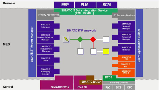 SIMATIC IT Production Suite fills the gap between Business Systems (typically ERPs) and Control Systems, allowing the conditions for an increase in the efficiency of the overall supply chain